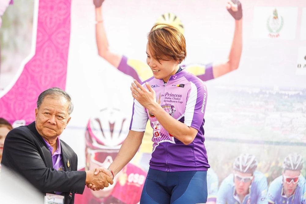 Tay đua Nguyễn Thị Thật trên bục nhận giải thưởng áo tím. Ảnh: VIAN