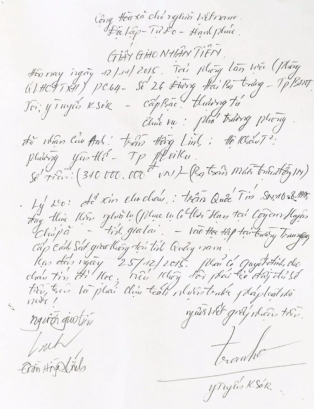 Giấy biên nhận tiền ông Y Tuyến ghi đầy đủ chức vụ để tạo sự tin tưởng