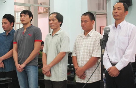 Nguyên trưởng Công an huyện Khánh Sơn Nguyễn Thành Trung (bìa phải) cùng các bị cáo trong vụ ăn chặn kỳ nam nghe đại diện VKS luận tội. Ảnh: TẤN LỘC