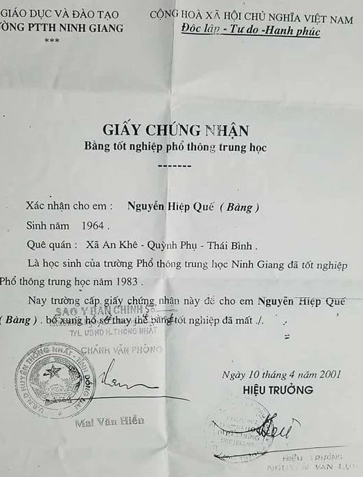 Xác nhận bằng tốt nghiệp THPT của Trường Ninh Giang xác nhận cho ông Nguyễn Hiệp Quế. Ảnh: VH