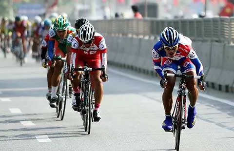 Nguyễn Vũ Linh (bìa phải) xé áo vàng ngoạn mục sau chặng Thanh Hóa - Vinh. Ảnh: MQ