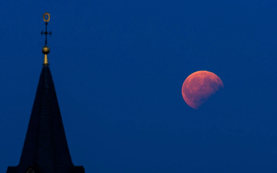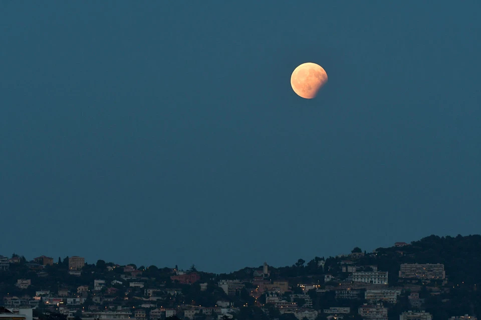 Nguyệt thực một phần ở Nice, miền Nam nước Pháp tối 7/8. Nguyệt thực một phần chỉ xảy ra khi trăng tròn và đồng thời Mặt Trời, Trái Đất và Mặt Trăng gần như nằm thẳng hàng, trong đó Trái Đất nằm giữa. Ảnh: AFP/Getty.