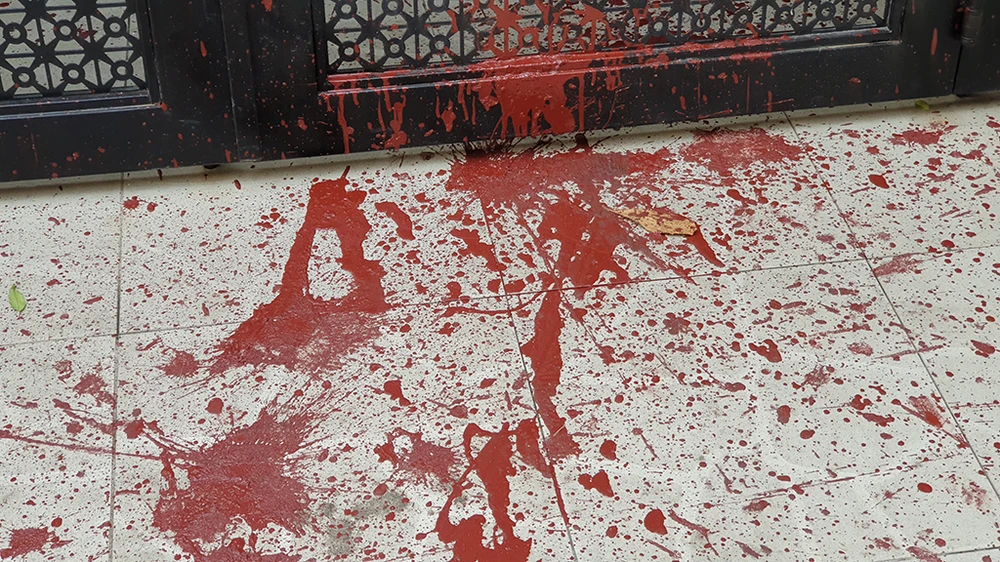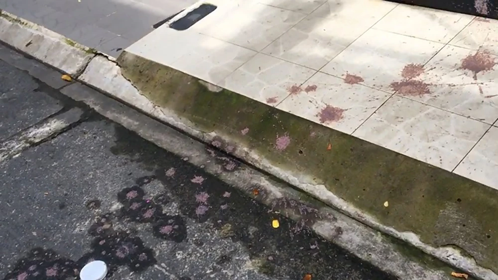 Ghi nhận, sơn đỏ loang lổ khắp cổng sắt, ổ khóa, tường nhà và cổng ra vào bốc mùi nặng và rất khó chùi rửa.