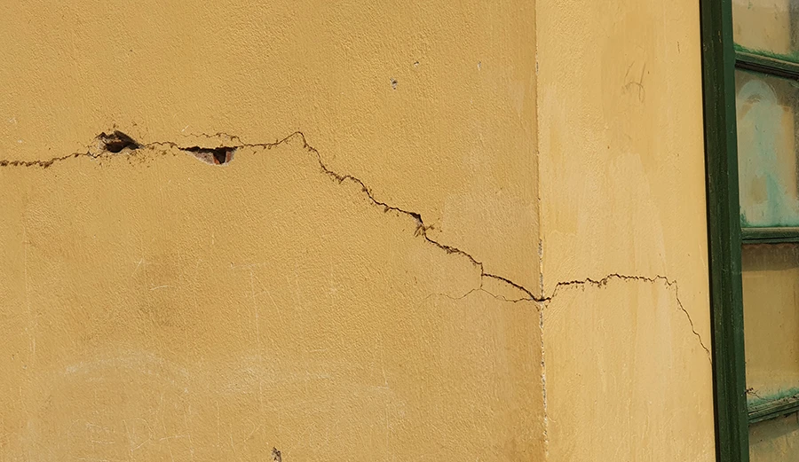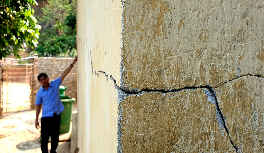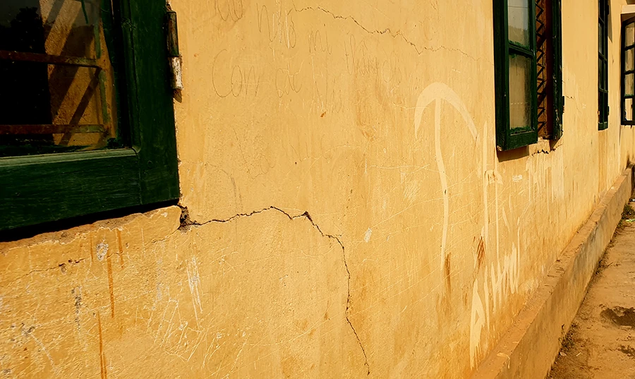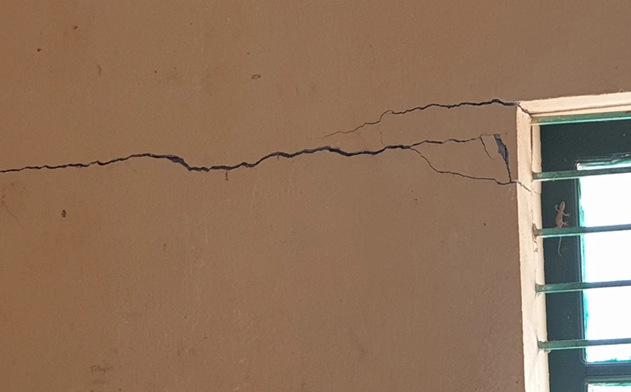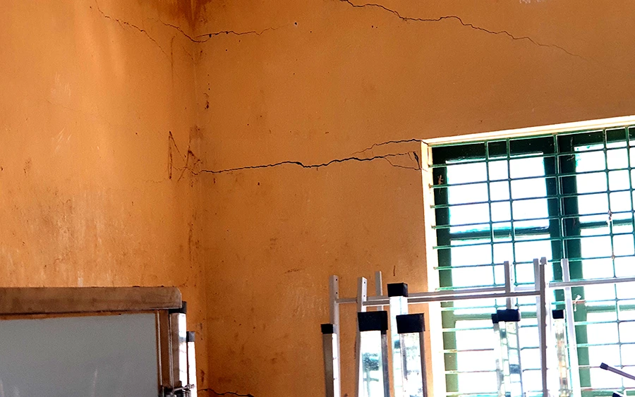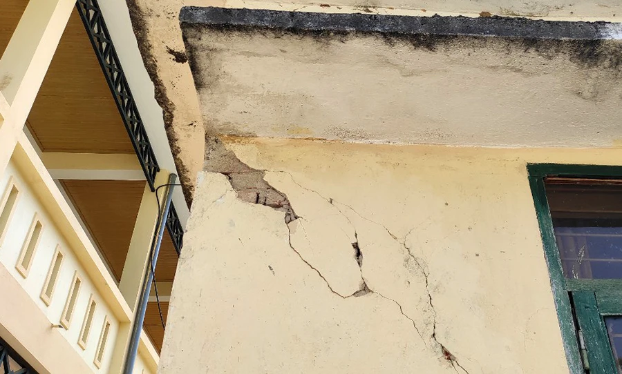 Bức tường phía sau dãy phòng học rạn nứt, tiềm ẩn nguy cơ mất an toàn.