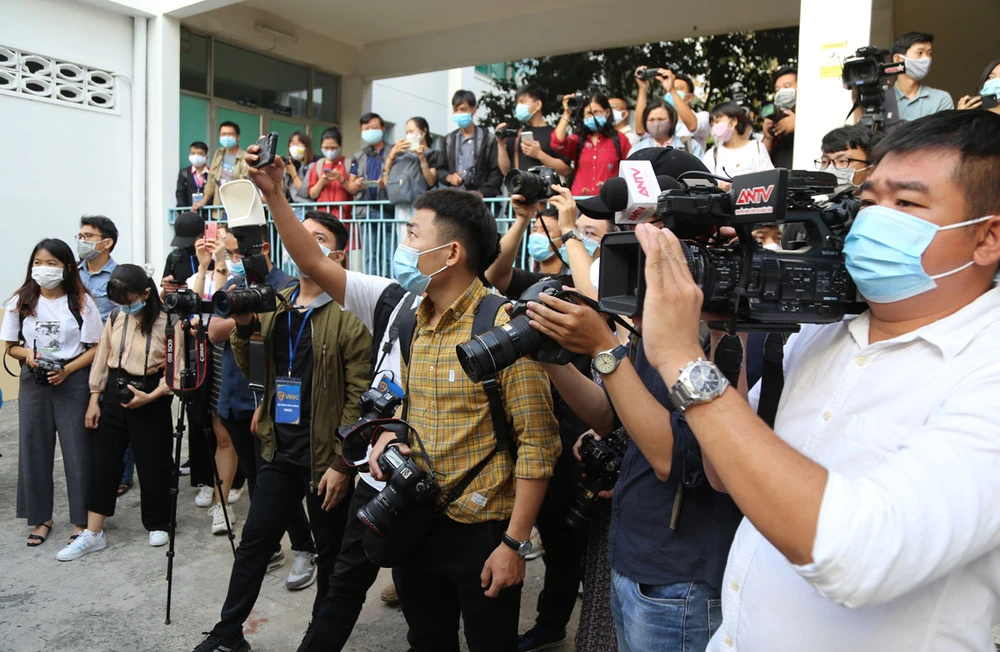 Phóng viên tác nghiệp tại sự kiện tiêm những liều vaccine COVID-19 đầu tiên cho các y bác sĩ và nhân viên Bệnh viện Bệnh Nhiệt đới TP.HCM, hồi tháng 3 vừa qua. Ảnh: HOÀNG GIANG