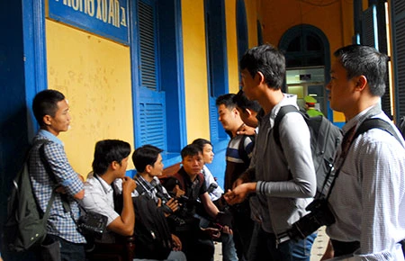 Các nhà báo đợi trước cửa phòng xử án TAND TP.HCM để đưa tường thuật một phiên tòa. Ảnh: HTD