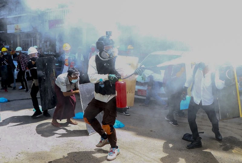 Người biểu tình đeo mặt nạ và kính bảo hộ đối đầu với lực lượng quân đội Myanmar. Ảnh: REUTERS