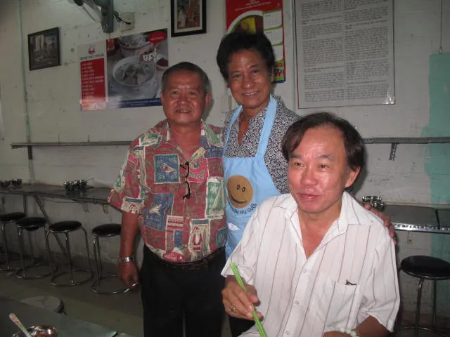 Ca sĩ Chế Linh (giữa) phục vụ tại quán cơm Nụ Cười. Bên trái là nhà báo Nam Đồng. Ảnh: Hòa Bỉnh