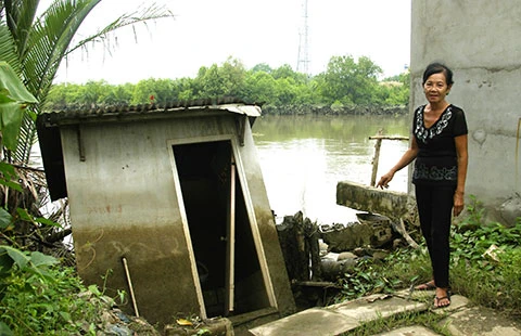 Bờ sông vào đến nhà khiến nhà vệ sinh của gia đình bà Dương Kim Đê ngã sụp. Ảnh: MQ