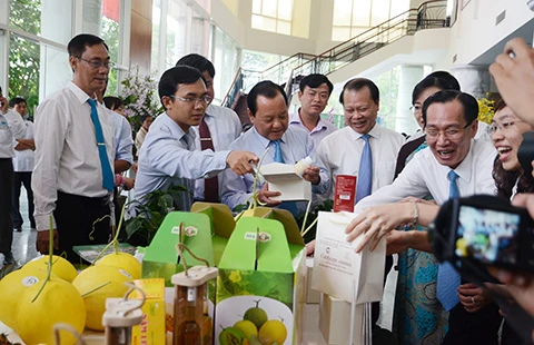Phó Thủ tướng Vũ Văn Ninh cùng Bí thư Thành ủy TP.HCM Lê Thanh Hải và các đại biểu tham quan các gian hàng giới thiệu sản phẩm nông nghiệp. Ảnh: LONG HỒ