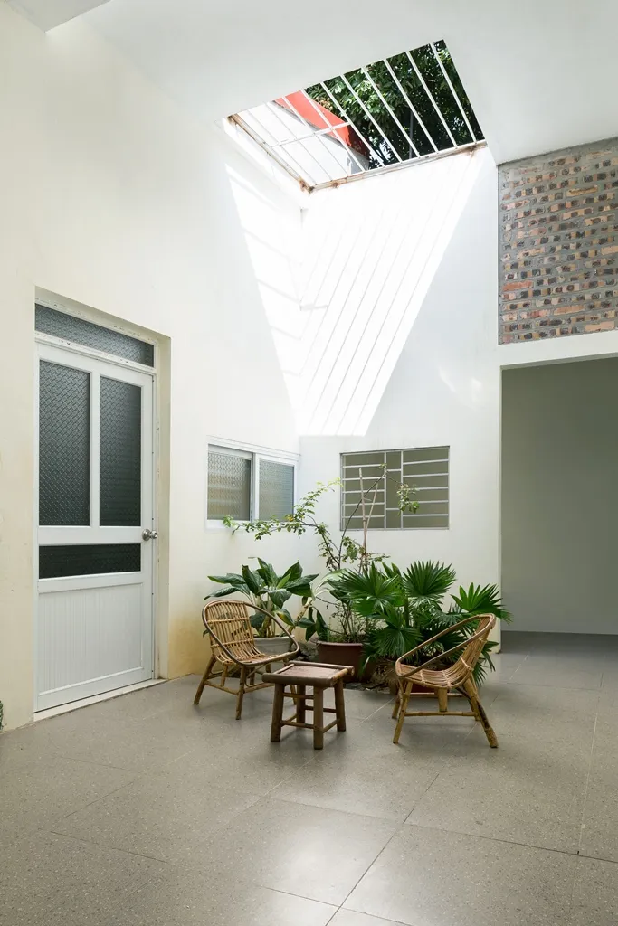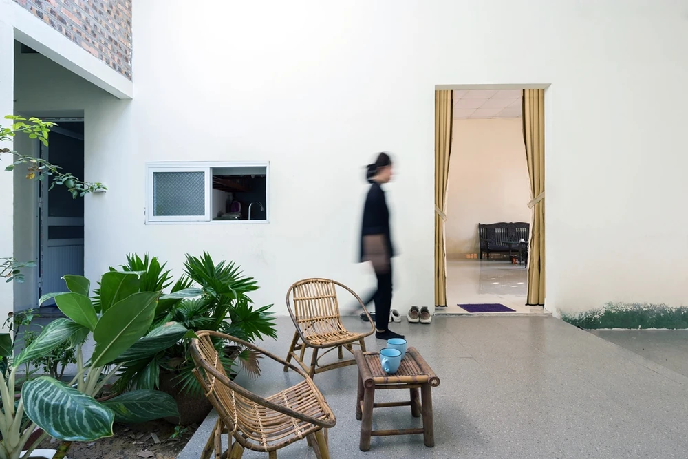Ngoài không gian chức năng đảm bảo sinh hoạt cho cả hộ gia đình thì các khoảng xanh, sân vườn nhỏ được thiết kế kết hợp với giếng trời và các hành lang sân trong chạy dài là cách KTS đưa sinh khí dẫn lối vào từng không gian trong ngôi nhà.