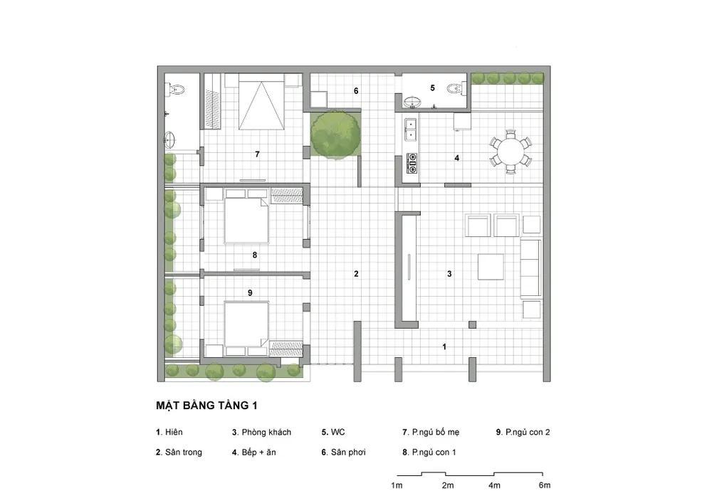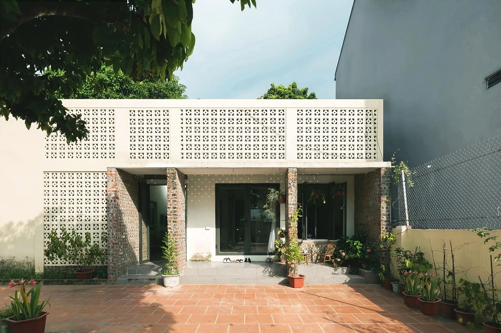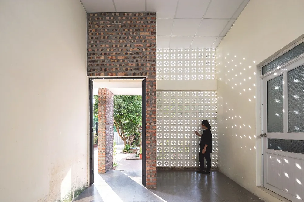 Cùng với việc xử lý hình khối và cấu trúc mặt đứng 1, 2 lớp, với họa tiết gạch bông gió xưa không chỉ góp phần tăng thẩm mỹ cho diện mạo ngôi nhà, nó còn giúp không gian ở bên trong tránh được bức xạ trực tiếp từ hướng Tây nhưng vẫn giao thoa được với thiên nhiên bên ngoài.
