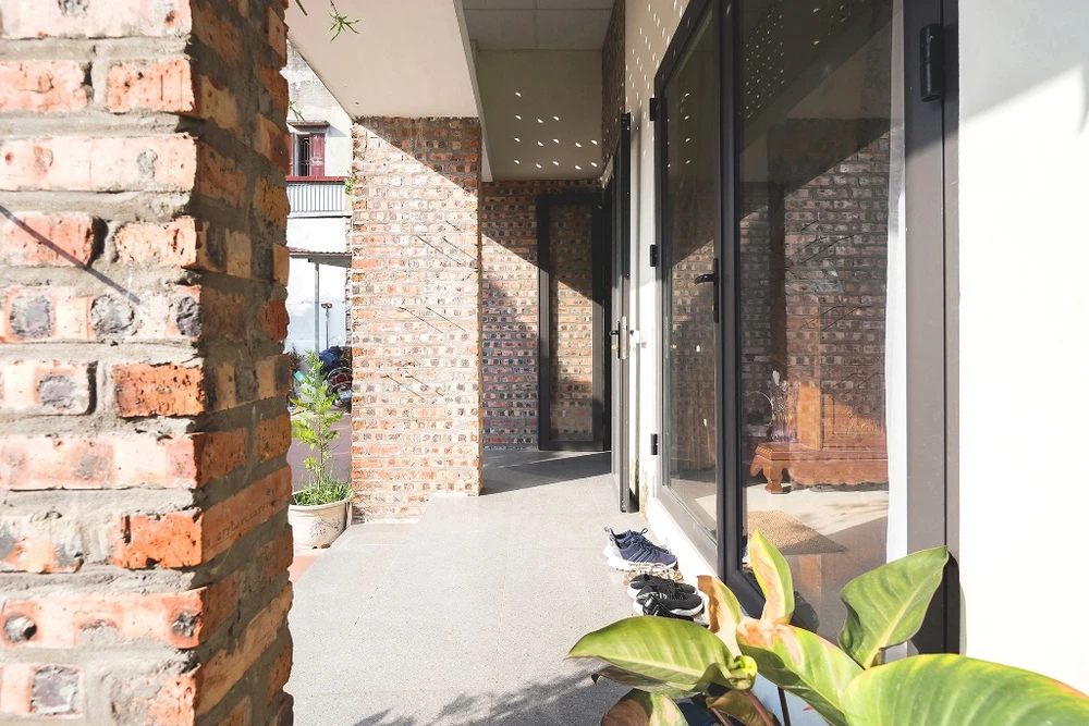 Các mảng tường đứng trước hiên được xây mới bằng gạch đỏ thô mộc, không trát cùng với dụng ý tách khối hiên làm điểm nhấn cho toàn bộ mặt tiền phẳng.