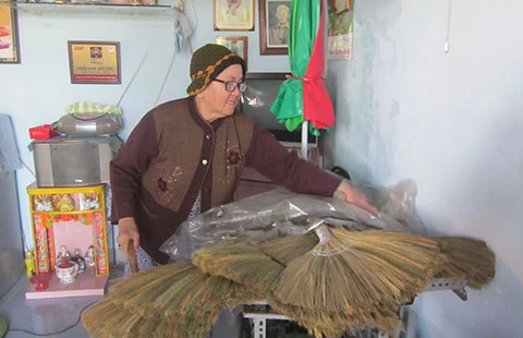 Trong ngôi nhà mới ấm cúng, bà Huệ đang chuẩn bị lô chổi để người con đưa ra chợ bán kiếm tiền trang trải ngày tết. Ảnh: NH
