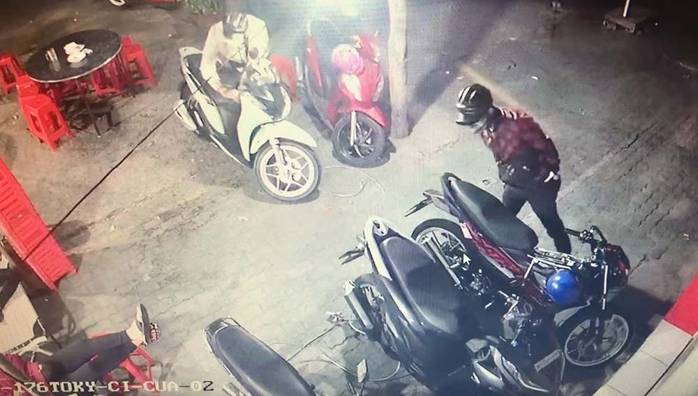 Hình ảnh cho thấy hai nam thanh niên độ tuổi chừng 25 đến 30, đội mũ bảo hiểm, đeo khẩu trang cùng phối hợp cắt khóa, lấy xe trong vòng khoảng 3 phút. Trong lúc đó, người nhà chị Lệ nằm ngủ cách đó chỉ khoảng 2 m.
