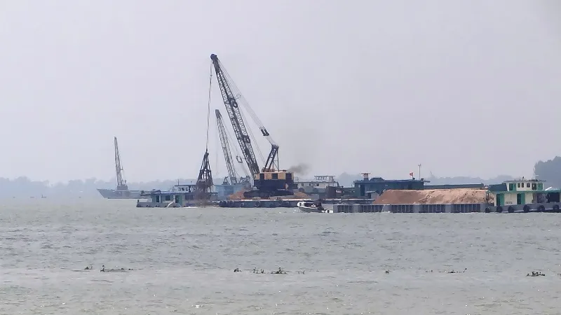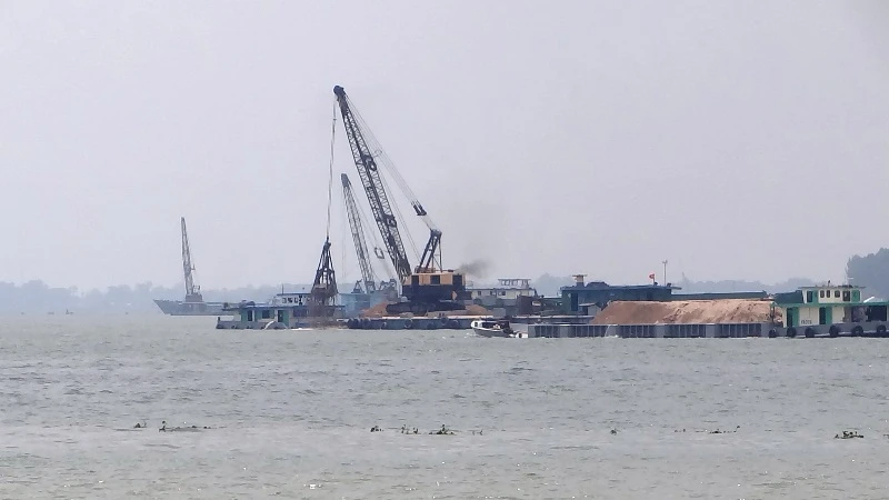 Hoạt động nạo vét tận thu cát diễn ra nhộn nhịp trên sông Tiền gần đoạn bị sạt lở. Đại diện Sở TN&MT tỉnh Đồng Tháp cho biết hiện có một dự án nạo vét. do Bộ GTVT TP cấp phép vẫn đang hoạt động. Có một dự án nạo vét khác cũng do Bộ GTVT cấp phép nhưng chưa triển khai vét tận thu cát vì bị dân phản đối do lo sợ sạt lở lấn sâu mà mất đất, mất nhà. Ảnh: TRUNG THANH