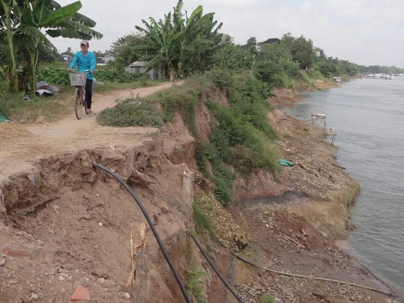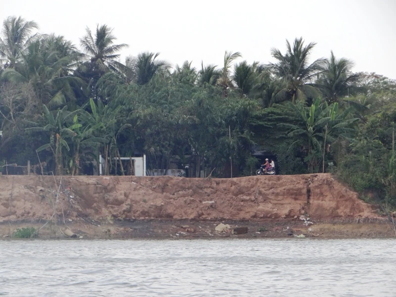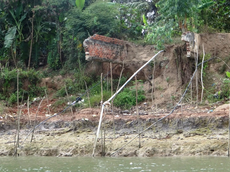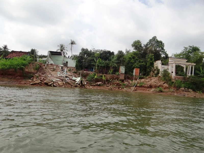 Bờ sông Tiền đoạn qua địa bàn xã Phước Thuận, huyện Hồng Ngự, Tiền Giang bị sạt lở sâu khoảng 60 m. Vụ sạt lở gần đây nhất vào giữa tháng 3-2017, làm hơn 1.000 m3 đất cuốn xuống sông. Toàn xã có khoảng 5.000 hộ dân nhưng có hơn 1.000 hộ phải rơi vào cảnh di dời do sạt lở. Ảnh: TRUNG THANH