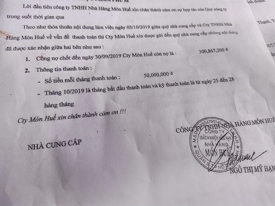 “Tại đây, Món Huế cam kết với người có công nợ trên 500 triệu đồng mỗi tháng sẽ trả 100 triệu đồng, còn công ty của chúng tôi có công nợ dưới 500 triệu đồng thì mỗi tháng sẽ trả 50 triệu đồng vào ngày 25 đến ngày 28 hằng tháng” - vị đại diện nói tiếp.