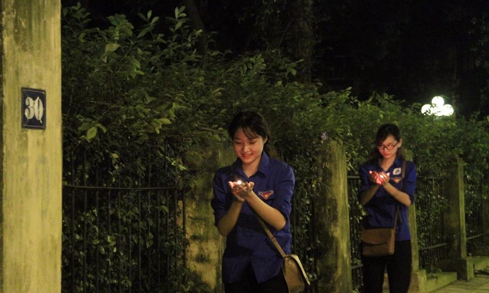 Ngay từ tối, nhiều bạn trẻ tình nguyện viên đã đến trước cổng nhà số 30 Hoàng Diệu để thắp nến. Bạn Mỹ Linh - SV ĐH Quốc gia Hà Nội cho biết: Tối nay chúng em đến đây để thắp nến để tỏ lòng thành kính, tưởng nhớ công ơn của Đại tướng và các vị anh hùng, liệt sĩ.