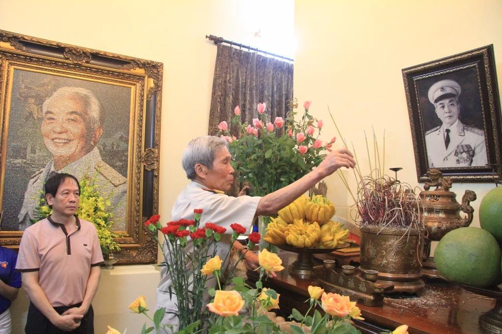 Đại tá, Anh hùng lực lượng vũ trang nhân dân La Văn Cầu (bên trái) cũng về thăm, thắp hương cho Đại tướng vào dịp này... Con trai Đại tướng - ông Võ Hồng Nam (thứ hai bên trái từ ngoài vào) xúc động ra đón đoàn.