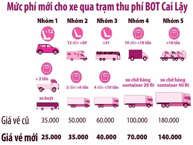 Bên cạnh đó, giảm 100% mức phí cho các phương tiện loại 1 và loại 2 đối với người dân thường trú tại các xã Phú Nhuận, Mỹ Thành Nam, Bình Phú và Phú An thuộc huyện Cai Lậy (không kinh doanh vận tải).
