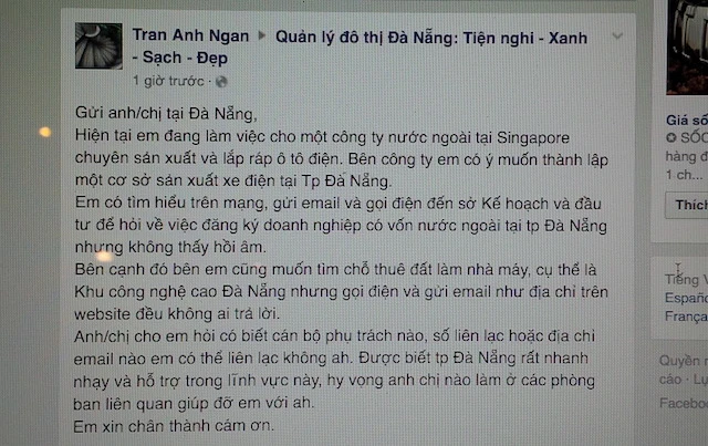 Trên trang Facebook “Quản lý đô thị Đà Nẵng: Tiện nghi - Xanh - Sạch - đẹp”, Facebook Tran Anh Ngan đã đăng nội dung: “Anh/chị cho em hỏi có biết cán bộ phụ trách nào, số liên lạc hoặc địa chỉ email nào em có thể liên lạc không ạ? Được biết TP Đà Nẵng rất nhanh nhạy và hỗ trợ trong lĩnh vực này, hy vọng anh chị nào làm ở các phòng ban liên quan giúp đỡ em với ạ. Em xin chân thành cám ơn”.