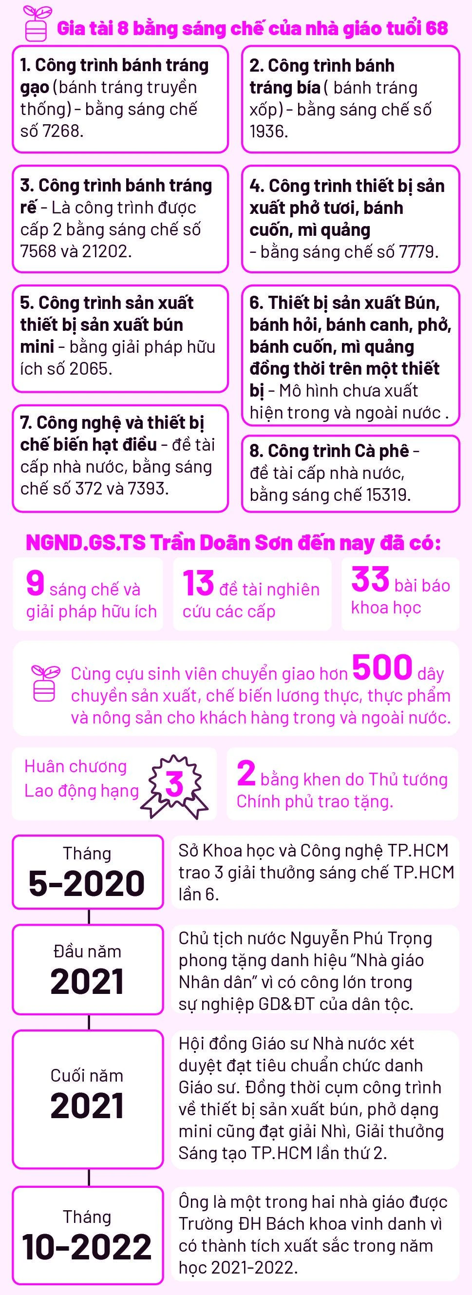 Ngoài ra, ông và cộng sự còn cho ra đời nhiều thiết bị, máy móc phục vụ chế biến thực phẩm như dây chuyền tự động sản xuất bánh tráng gạo, bánh pía, bánh rế; thiết bị sản xuất phở tươi, bánh cuốn, mì quảng dạng mini; công nghệ sản xuất bún, bánh hỏi, bánh canh, phở, bánh cuốn, mì quảng trên cùng một thiết bị.