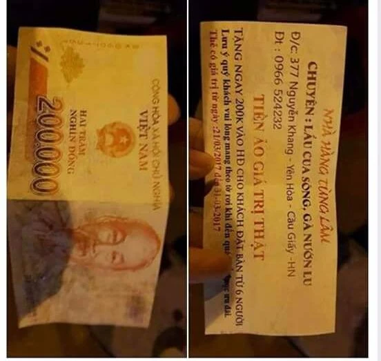 Ngày 22-3, Pháp Luật TP.HCM đã có thông tin phản ánh nhà hàng Tùng Lâm, phố Nguyễn Khang (Hà Nội) phát hành tờ rơi quảng cáo với dòng chữ "Tiền ảo giá trị thật". Điều đặc biệt, trên tờ giấy đó lại in hình tờ tiền mệnh giá 200.000 đồng như mẫu tiền thật. Mặt còn lại của tờ giấy in thông tin nhà hàng kèm chương trình khuyến mãi.