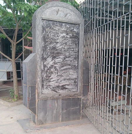 Bia di tích lịch sử bị cạo nham nhở, nằm trong mái tôn nhà hàng Canh Khoa. Ảnh: Đ.LAM