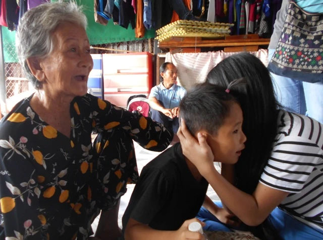 Một em nhỏ vui mừng được gặp lại gia đình.