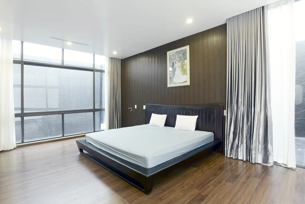 Tầng hai, các phòng ngủ đều được lấy sáng theo hướng bắc và hướng đông. Cách chắn nắng của các phòng ngủ khá đặc biệt với mảng tường chéo được sắp xếp, tính toán một cách hợp lí.