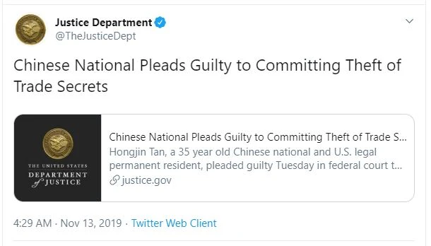 Twitter của Bộ Tư pháp Mỹ năm 2019 nói rằng ông Hongjin đã thừa nhận đánh cắp bí mật thương mại. Ảnh: TWITTER