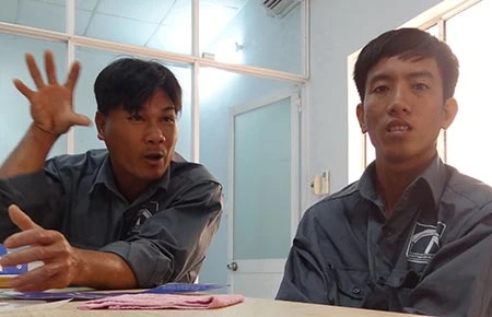 Hai công nhân từng bị bỏng do nguồn nước thải độc hại từ các nhà máy xả ra kể lại vụ việc với phóng viên. Ảnh: TR.THANH