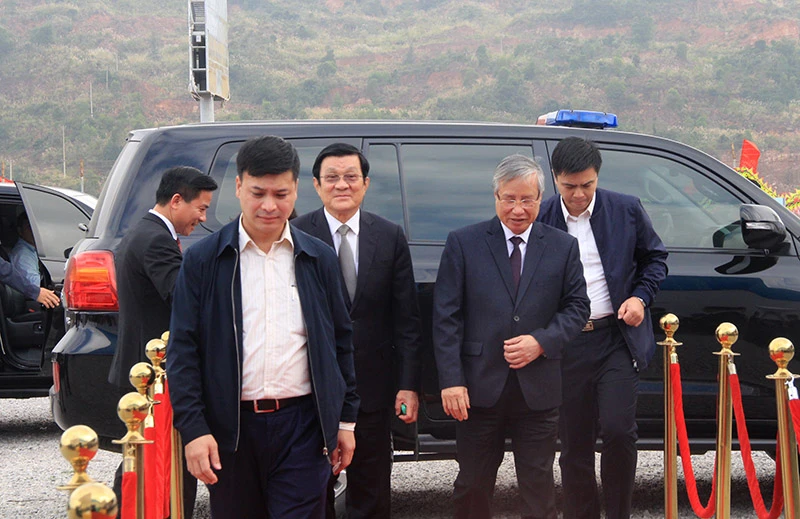 Nguyên Chủ tịch nước Trương Tấn Sang và ông Trần Quốc Vượng, Thường trực Ban Bí thư, dự lễ vận hành thương mại Liên hợp Lọc hóa dầu Nghi Sơn. Ảnh: Đ.TRUNG