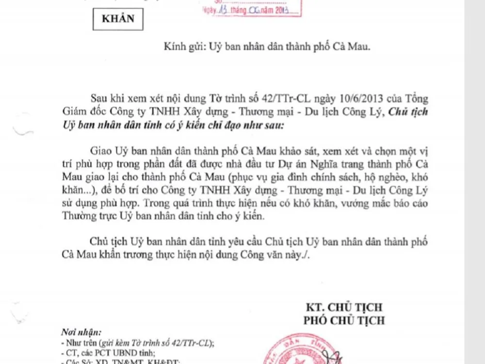 Phản hồi tờ trình này, hai ngày sau, ông Dương Tiến Dũng, khi đó là Phó chủ tịch UBND tỉnh Cà Mau có công văn khẩn gửi UBND TP. Cà Mau. Công văn truyền đạt ý kiến chỉ đạo của Chủ tịch tỉnh Cà Mau rằng UBND TP. Cà Mau xem xét bố trí một phần diện tích trong nghĩa trang TP. Cà Mau theo yêu cầu của Công ty Công Lý.