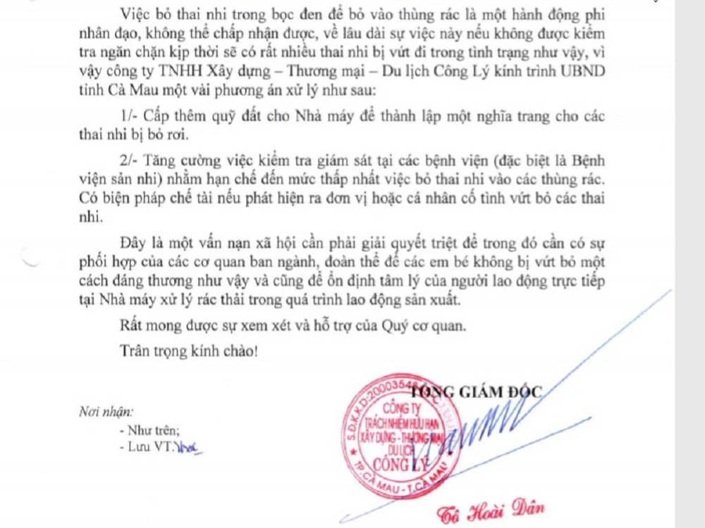 Theo hồ sơ lãnh đạo nhà máy rác TP. Cà Mau cung cấp, ngày 10-6-2013, ông Tô Hoài Dân, Tổng giám đốc Công ty Công Lý, đơn vụ chủ quản nhà máy rác có tờ trình số 42 gửi UBND tỉnh Cà Mau. Nội dung thể hiện sau khi đi vào hoạt động được vài tháng, các công nhân của nhà máy rác thải này đã phát hiện 10 xác thai nhi lẫn trong rác thải được tập kết về nhà máy.