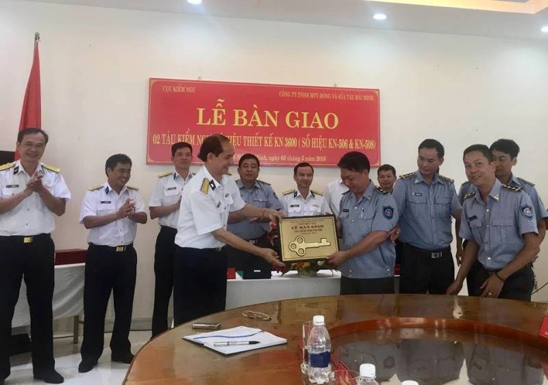 Bàn giao hai tàu kiểm ngư vỏ thép cỡ trung KN-506 và KN-508 cho Cục Kiểm ngư. Ảnh: VĂN DƯỠNG