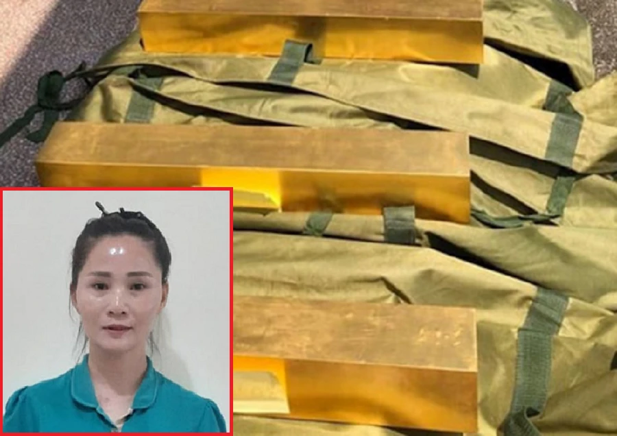 Nhà ngoại cảm “dỏm” Vũ Thị Hòa (ảnh nhỏ) và số vàng giả trong vụ án. Ảnh: CACC
