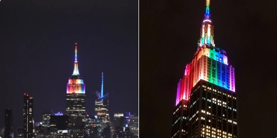 Tòa nhà Empire State tối 14-11 được thắp sáng với màu sắc cầu vồng để chúc mừng nước Úc thông qua luật cho phép hôn nhân đồng giới. Ảnh: TWITTER