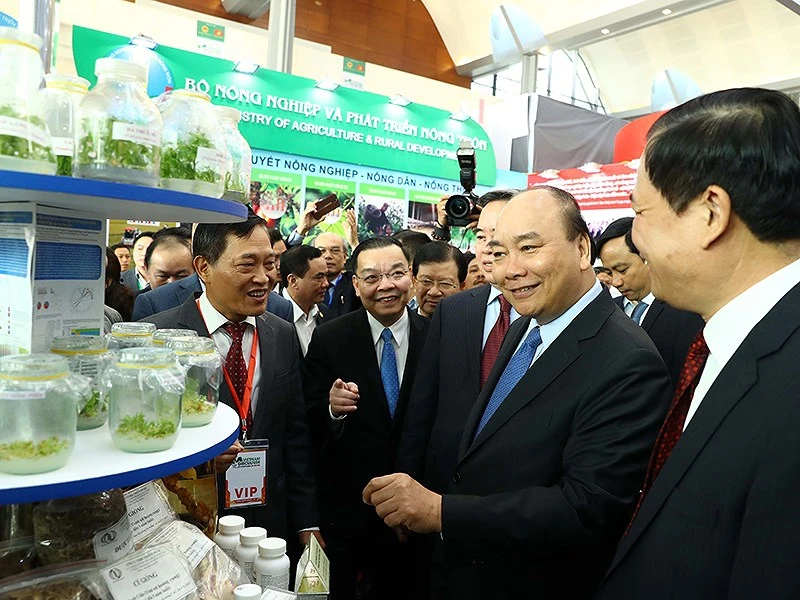 Thủ tướng Nguyễn Xuân Phúc và các đại biểu tham quan các gian hàng tại Triển lãm quốc gia tổng kết 10 năm thực hiện Nghị quyết Trung ương 7 (Khóa X) về nông nghiệp, nông dân, nông thôn. Ảnh: TTXVN