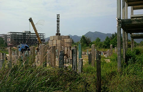 Các đơn vị thi công chỉ làm được bộ khung nhà rồi vứt chỏng chơ giữa đồi cát. Hệ thống cọc nhồi, sắt thép… nằm la liệt khắp nơi, vùi cả trong đất cát.
