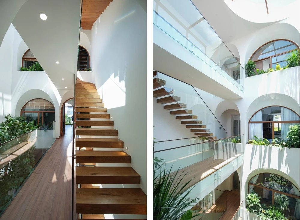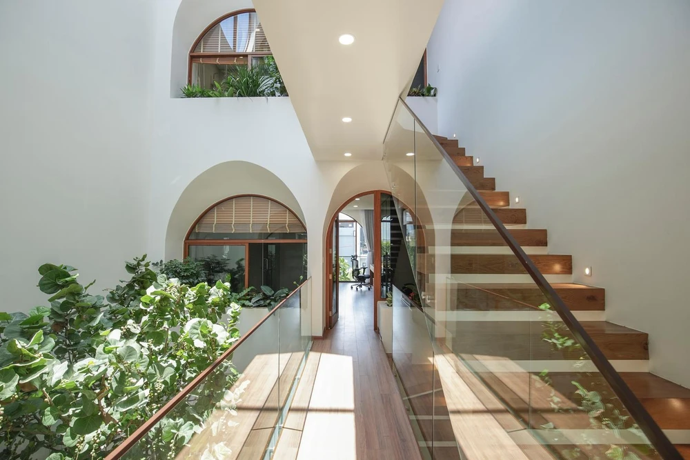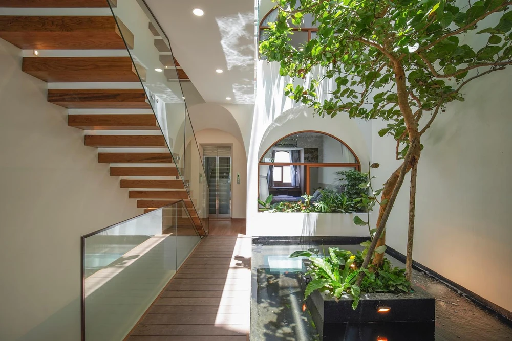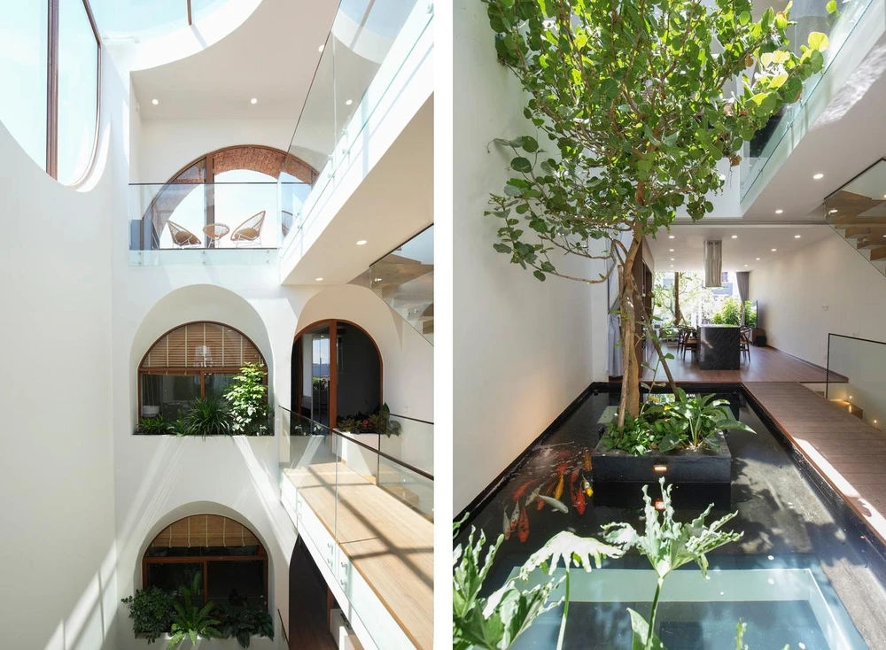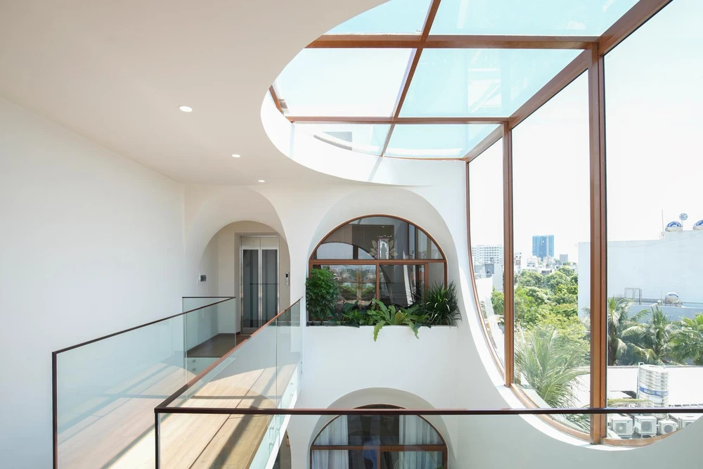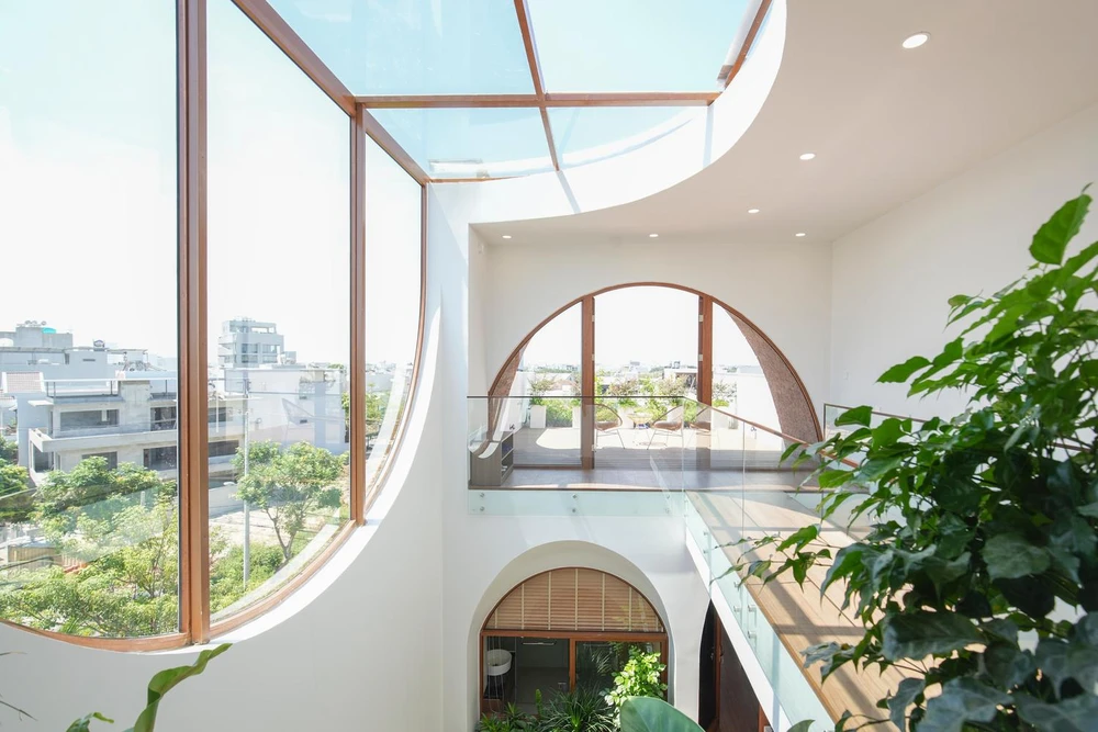 Đối với phần mái kính che giếng trời, kiến trúc sư sử dụng kính cách nhiệt hạn chế tia UV có hại chiếu vào nhà nhưng vẫn tận dụng được tối đa nguồn sáng.