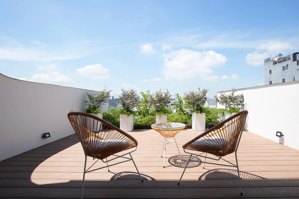Ở không gian này, kiến trúc sư sử dụng cây xanh và sàn gỗ như một cách để chống nóng cho các tầng dưới. Trên Mái nhà, kiến trúc sư sử dụng tấm chống nóng XPS trên nền bê tông để bảo vệ và chống nóng hiệu quả.