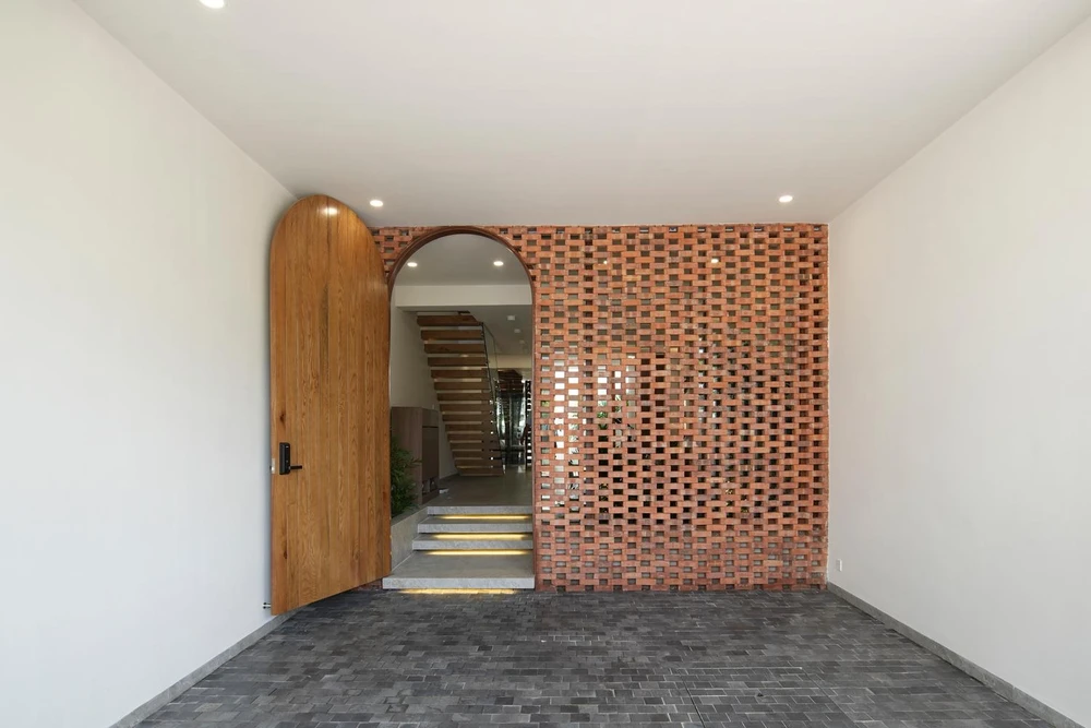 Ở tầng trệt, ngoài cùng là khu vực để xe. Không gian này được ngăn cách với không gian sống bằng một bức tường gạch.