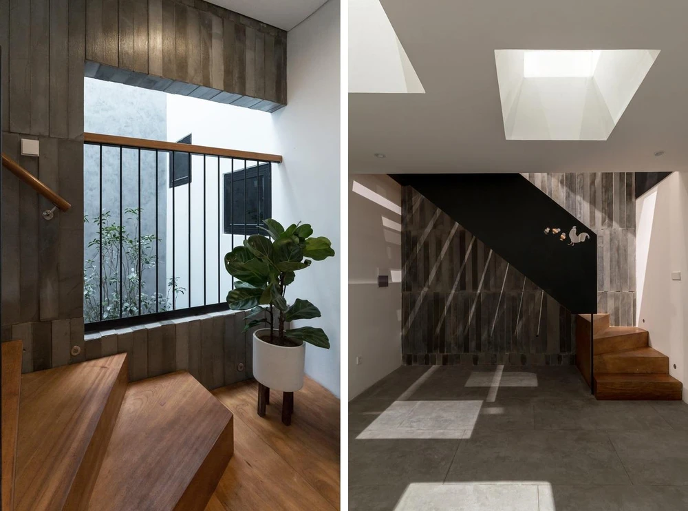 Căn nhà có ba mặt nhận ánh sáng nhưng thực tế chỉ có hai hướng tiếp cận chính là phía trước và phía sau.