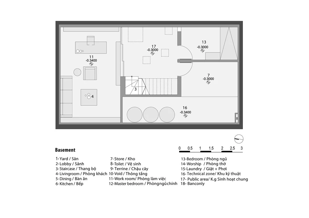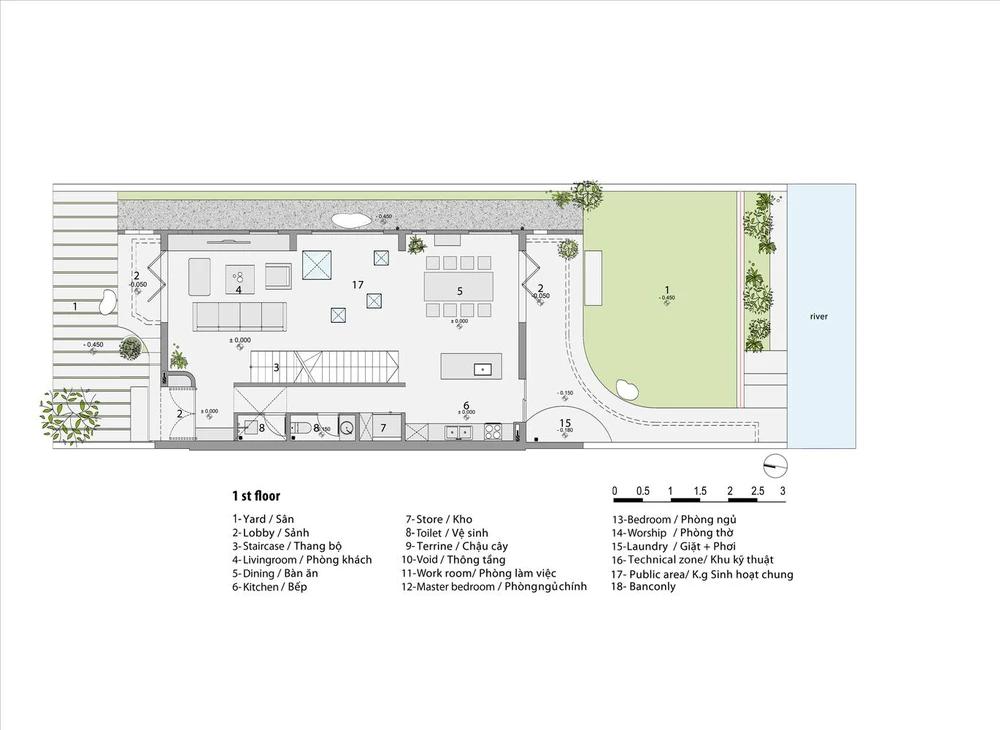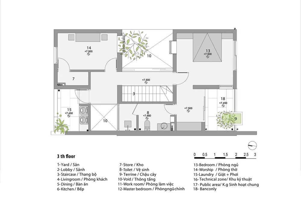 Đây là một căn nhà liền kề có khoảng cách với ngôi nhà bên cạnh rất hạn chế, chỉ 3 m nên đòi hỏi nhóm thiết kế làm sao cho căn nhà thông thoáng, tràn ngập cây xanh.