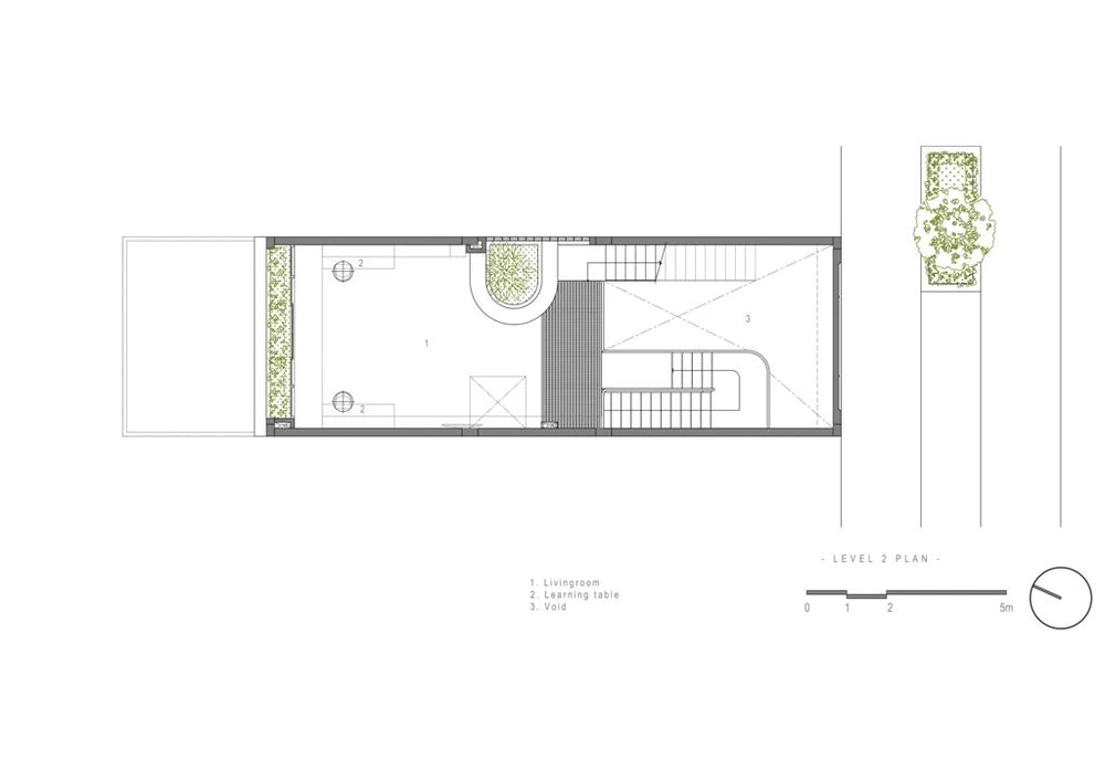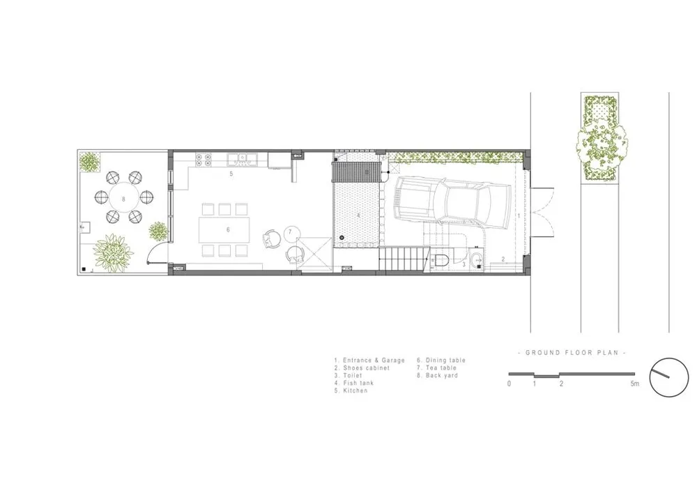 Tầng trệt và lửng dùng cho chức năng sinh hoạt chung, bếp ăn, gara, tiếp khách, sân vườn sau nhà tạo sự thoáng đãng cho không gian trệt. |