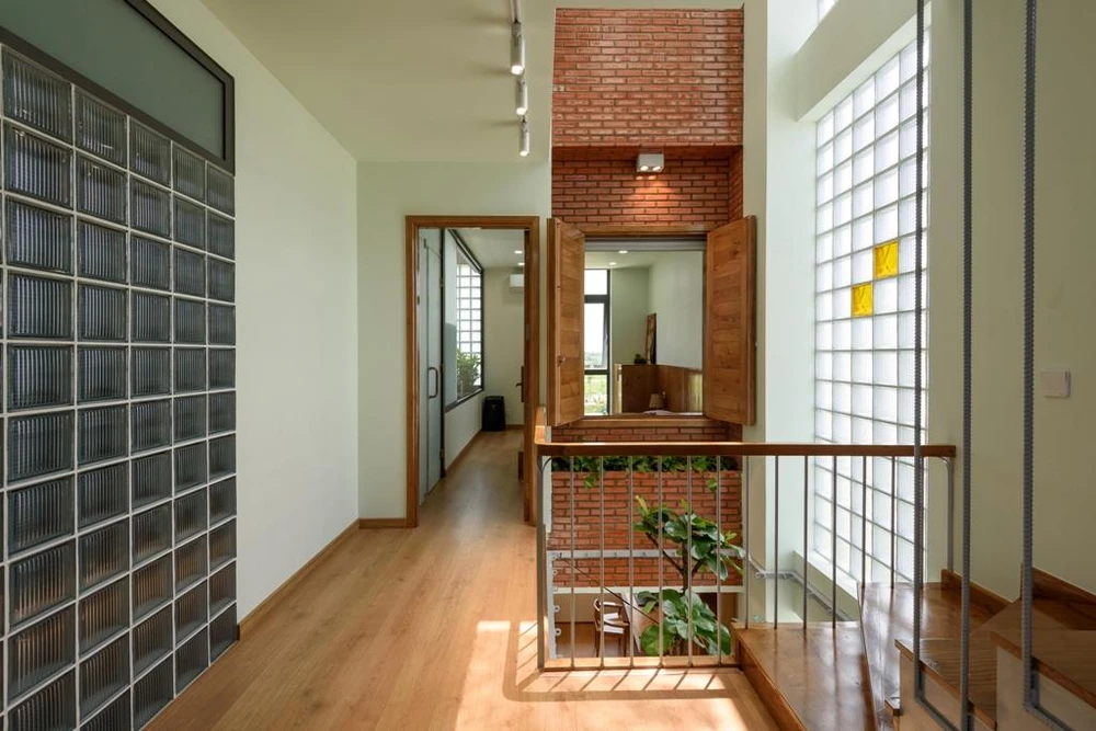 Nhóm thiết kế tận dụng một cạnh tường không giáp nhà bên cạnh, thay thế bằng tường gạch kính tăng sáng cho không gian bên trong. |