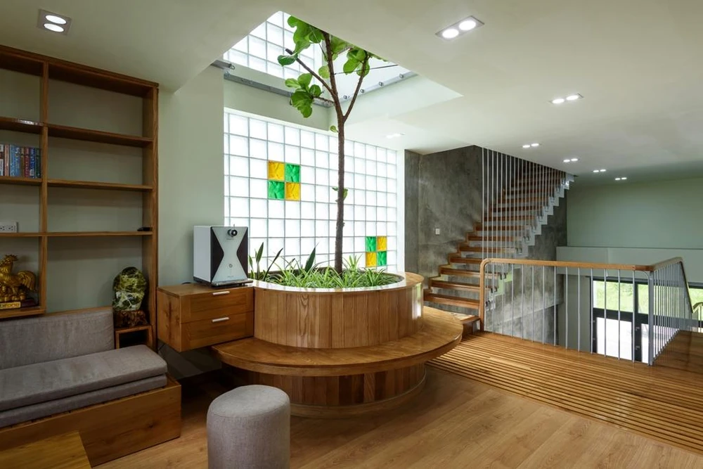 Nhóm thiết kế đã thay đổi vị trí thang, thêm vào nhiều khoảng thông tầng, mảng gạch kính. |