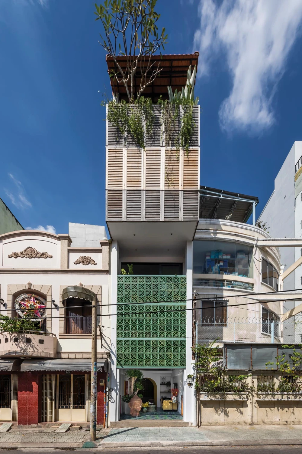 Mảng xanh trước mặt tiền, góc xanh nơi phòng khách, trên kệ trang trí, nơi gian bếp, các khung cửa sổ, ban công mỗi tầng, dưới gầm cầu thang tầng hai và xung quanh hồ bơi trên sân thượng.